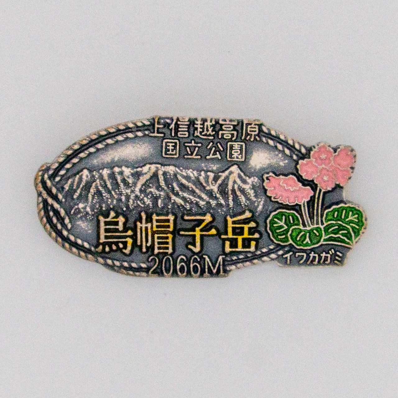 上信越高原国立公園の雄大な山並みと、山頂付近にひっそりと咲くイワカガミを精緻に彫り込んだメタルバッジ。
